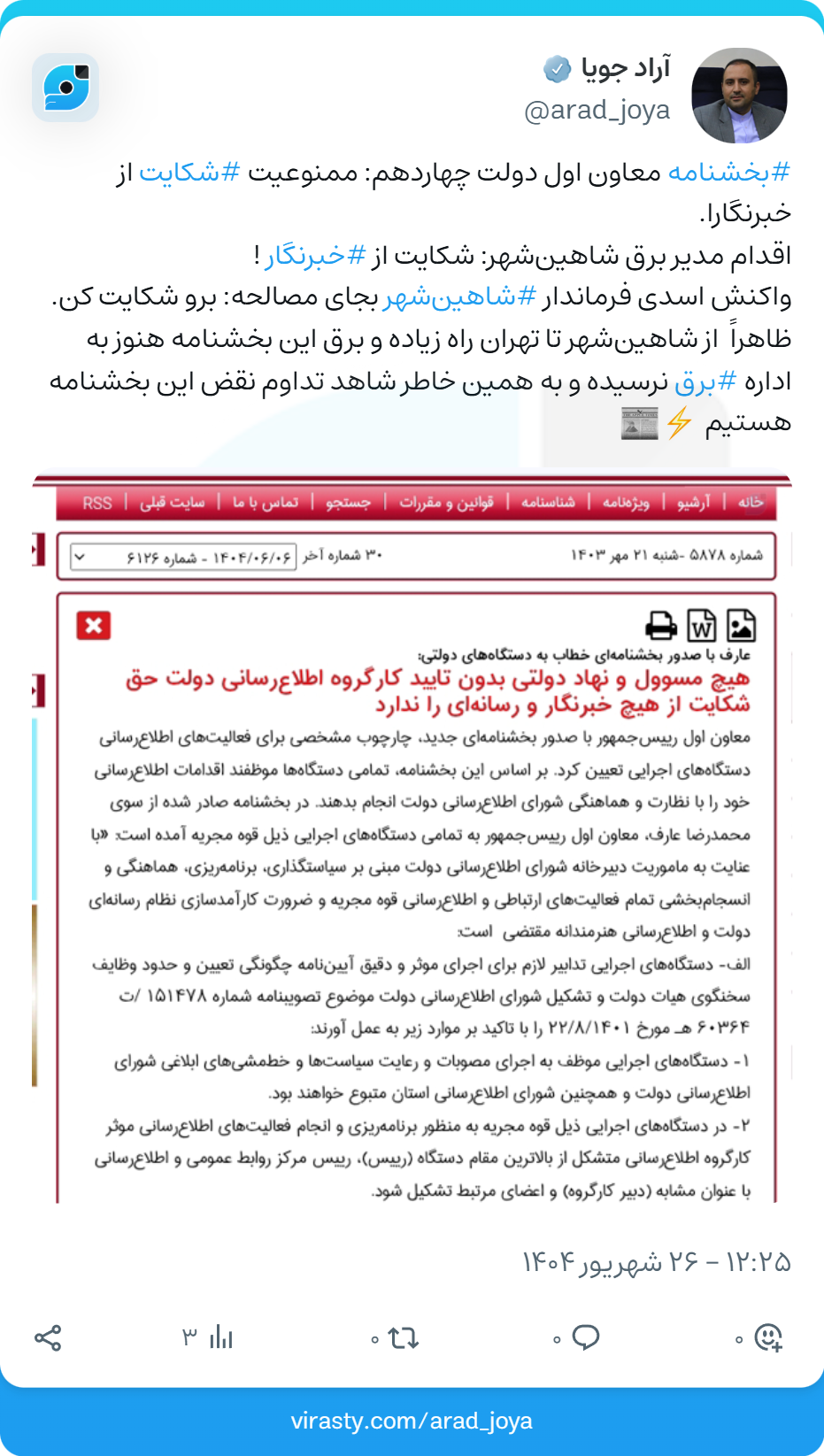 به گزارش پایگاه خبری اصفهان سبز ، نورالله جویا در پیامی در شبکه اجتماعی ویراستی نوشت: «بخشنامه معاون اول دولت چهاردهم شکایت از خبرنگاران را ممنوع کرده است، اما اداره برق شاهینشهر نه تنها از این بخشنامه تبعیت نکرده بلکه علیه این جانب به عنوان یک خبرنگار رسمی شکایت تنظیم کرده است.»وی افزود: «در حالیکه انتظار میرفت ناصر اسدی فرماندار شاهینشهر با نگاه مصالحهجویانه وارد موضوع شود، پاسخ او تنها این بوده است: برو شکایت کن. به نظر میرسد فاصله شاهینشهر تا تهران همچنان زیاد است و برق این بخشنامه هنوز به اداره برق نرسیده است.»گفتنی است این موضوع در شرایطی رخ داده که فعالان رسانهای اجرای دقیق این بخشنامه را گامی مهم در حمایت از آزادی مطبوعات و شفافیت اداری میدانند.